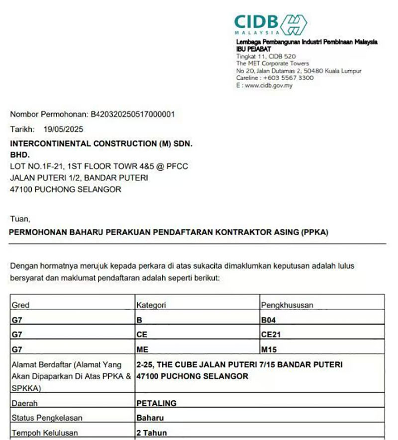 近日,經(jīng)馬來西亞建筑工業(yè)發(fā)展局(CIDB)批準,合景建設集團有限公司全資子公司洲際建設(馬來西亞)有限公司取得馬來西亞最高等級G7承包商資質,包括土木工程(CE21)、土建工程(B04)、機電工程(M15)以及各種機械工程等多項內容。這是合景建設在馬來西亞建筑資質領域的重大突破,意味著公司在智慧建筑領域的技術實力、屬地化服務能力及行業(yè)影響力獲官方權威認可。